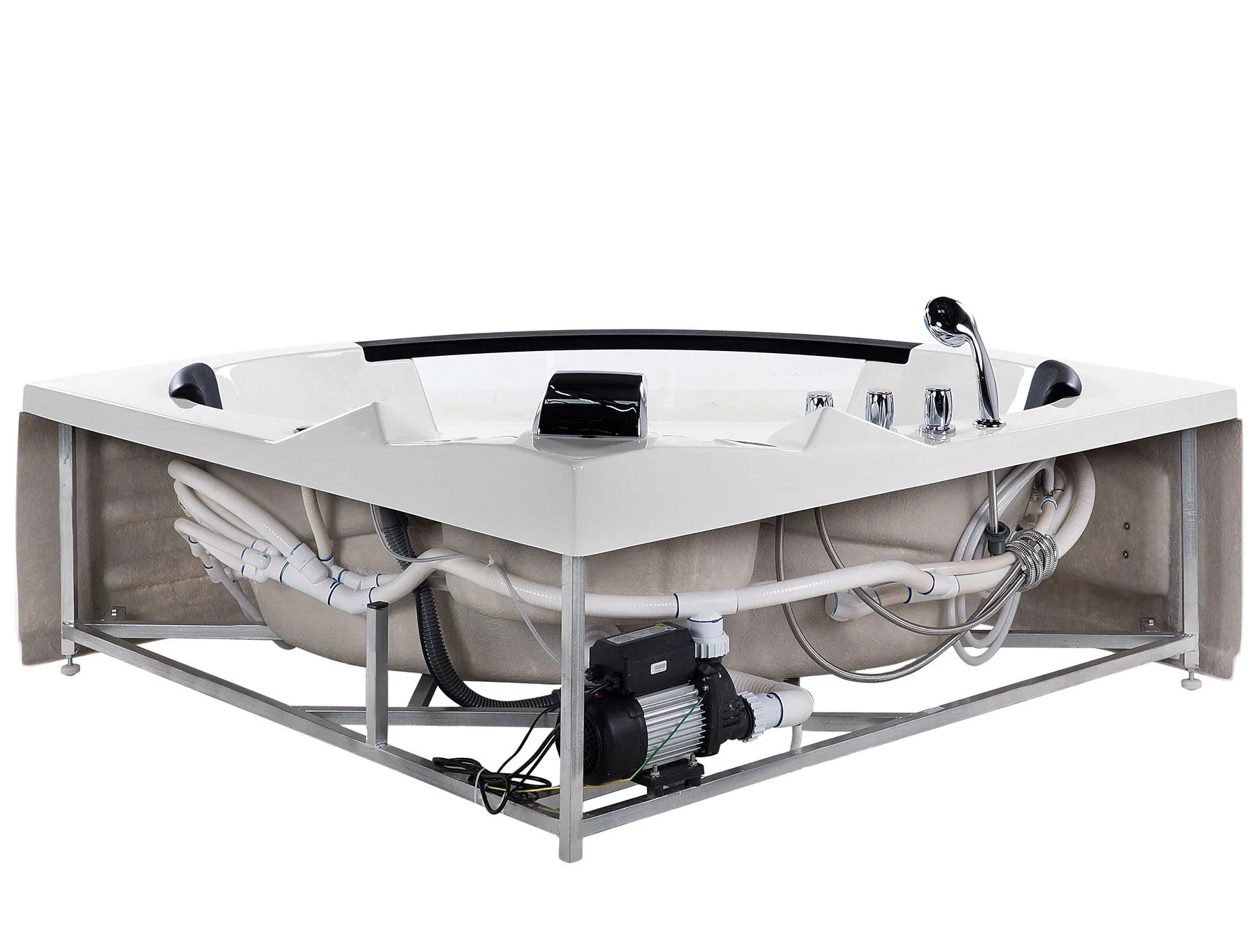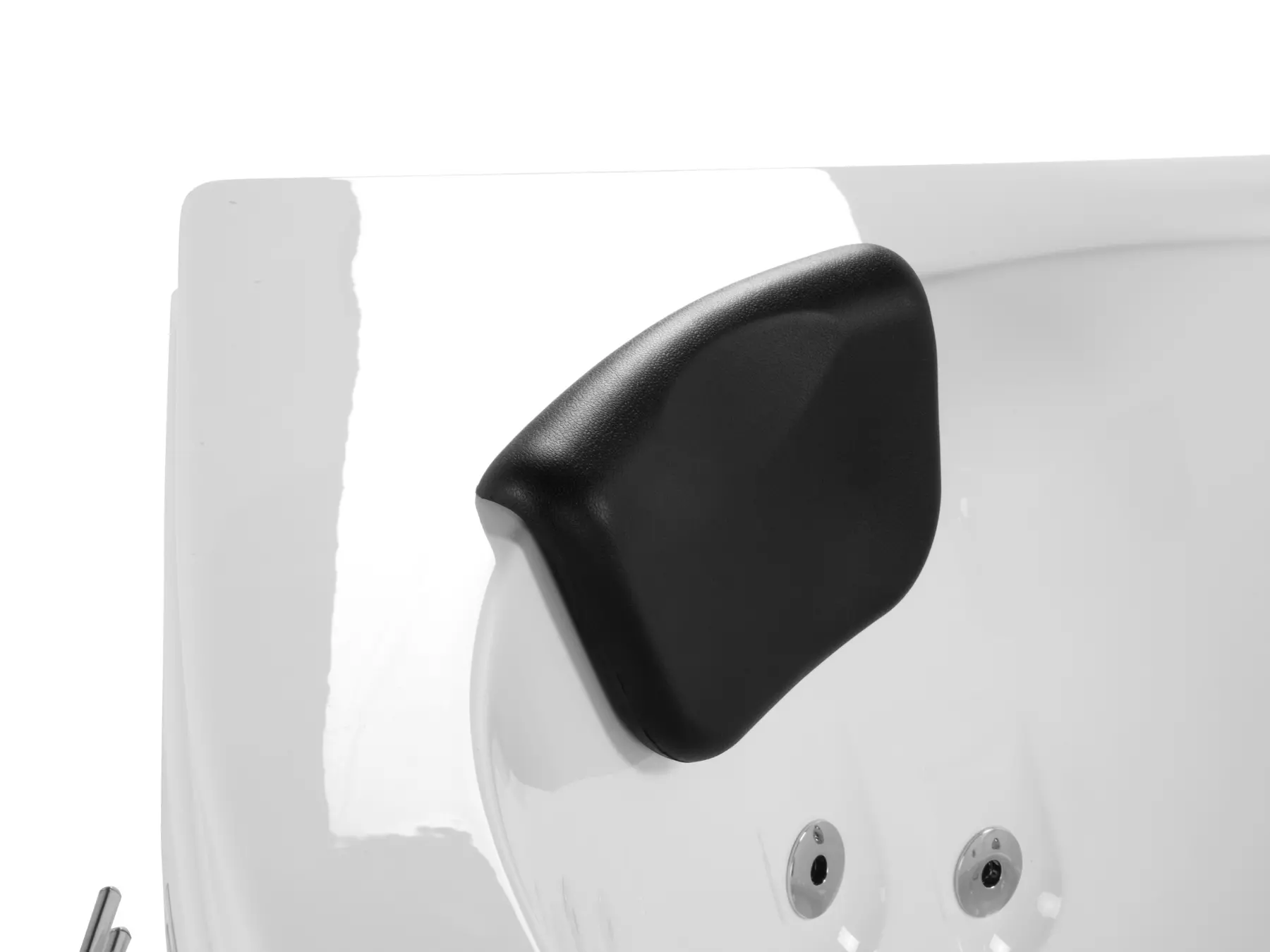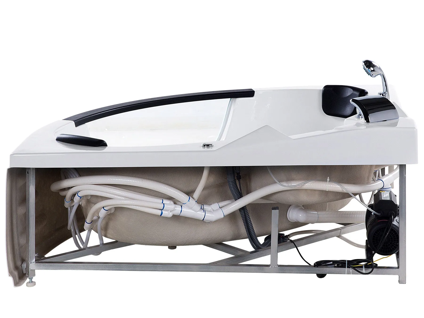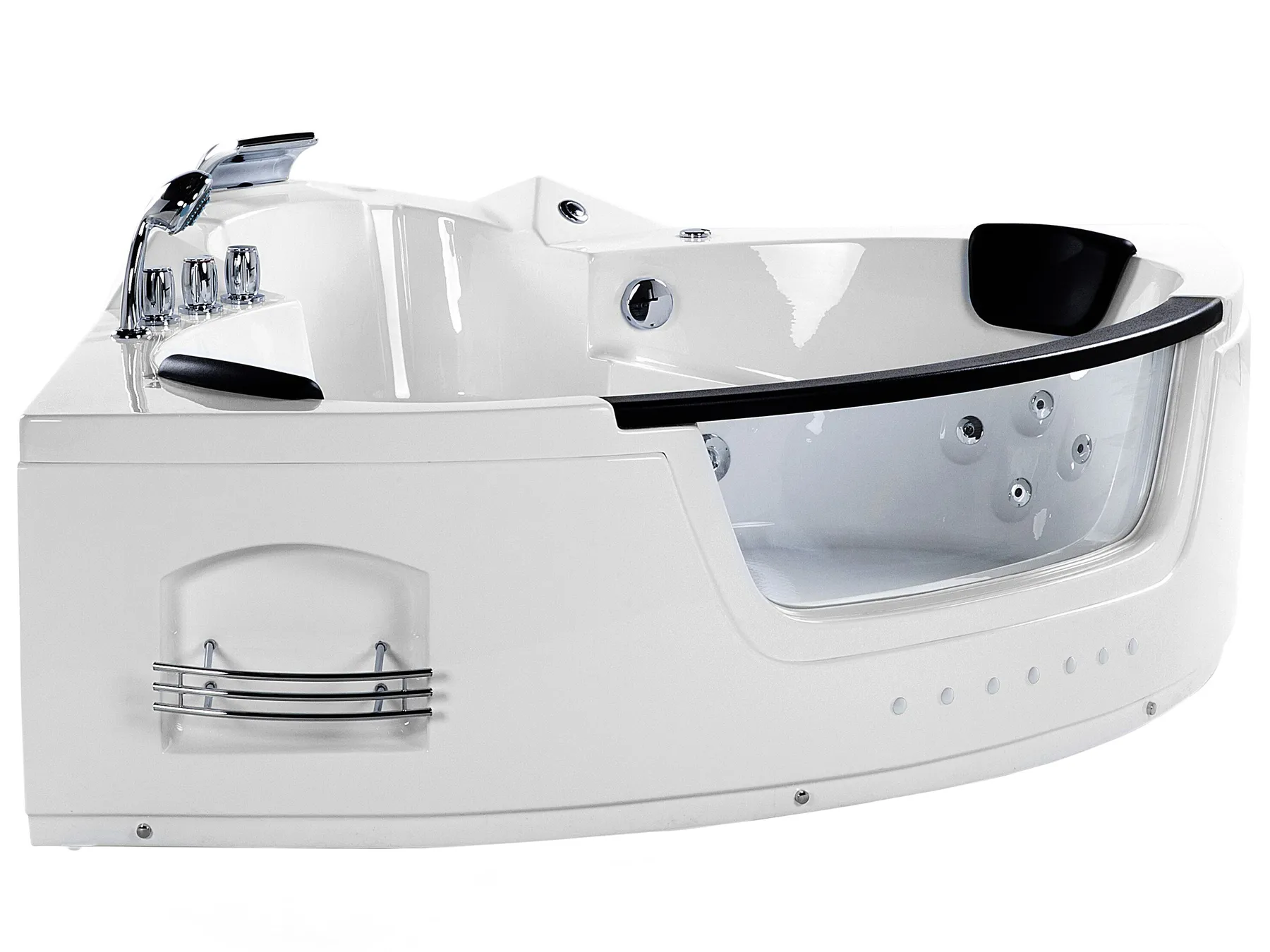 A stunning corner tub with enough room to comfortably accommodate up to two people. Transparent tempered glass panel adds a stylish touch. Designed with elegant chromed fittings, waterfall tap included, and two padded headrests in sophisticated black colour. It comes with 4 large and 8 smaller jet-stream nozzles and an underwater LED lighting system, so you can have a spa-like experience in the comfort of your own home. Featuring an elegant design that will blend with any modern bathroom interior.