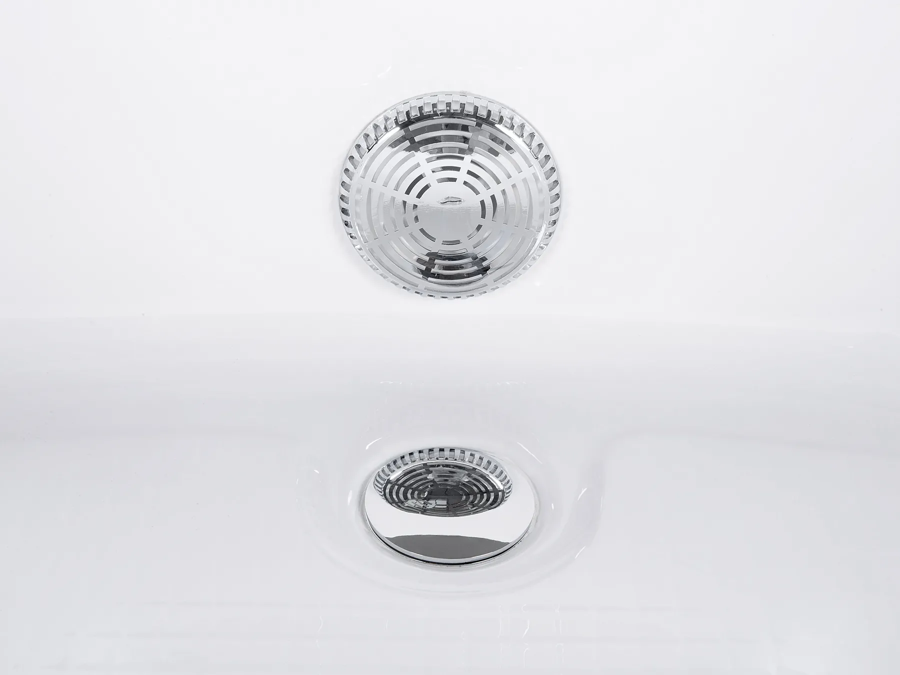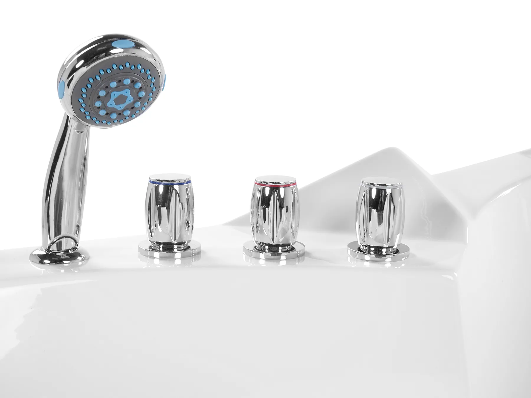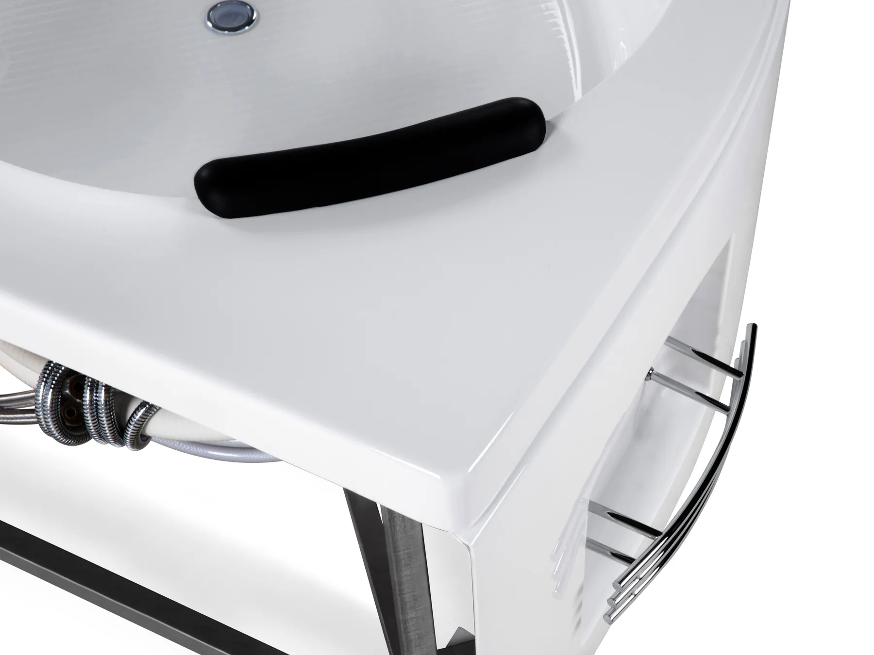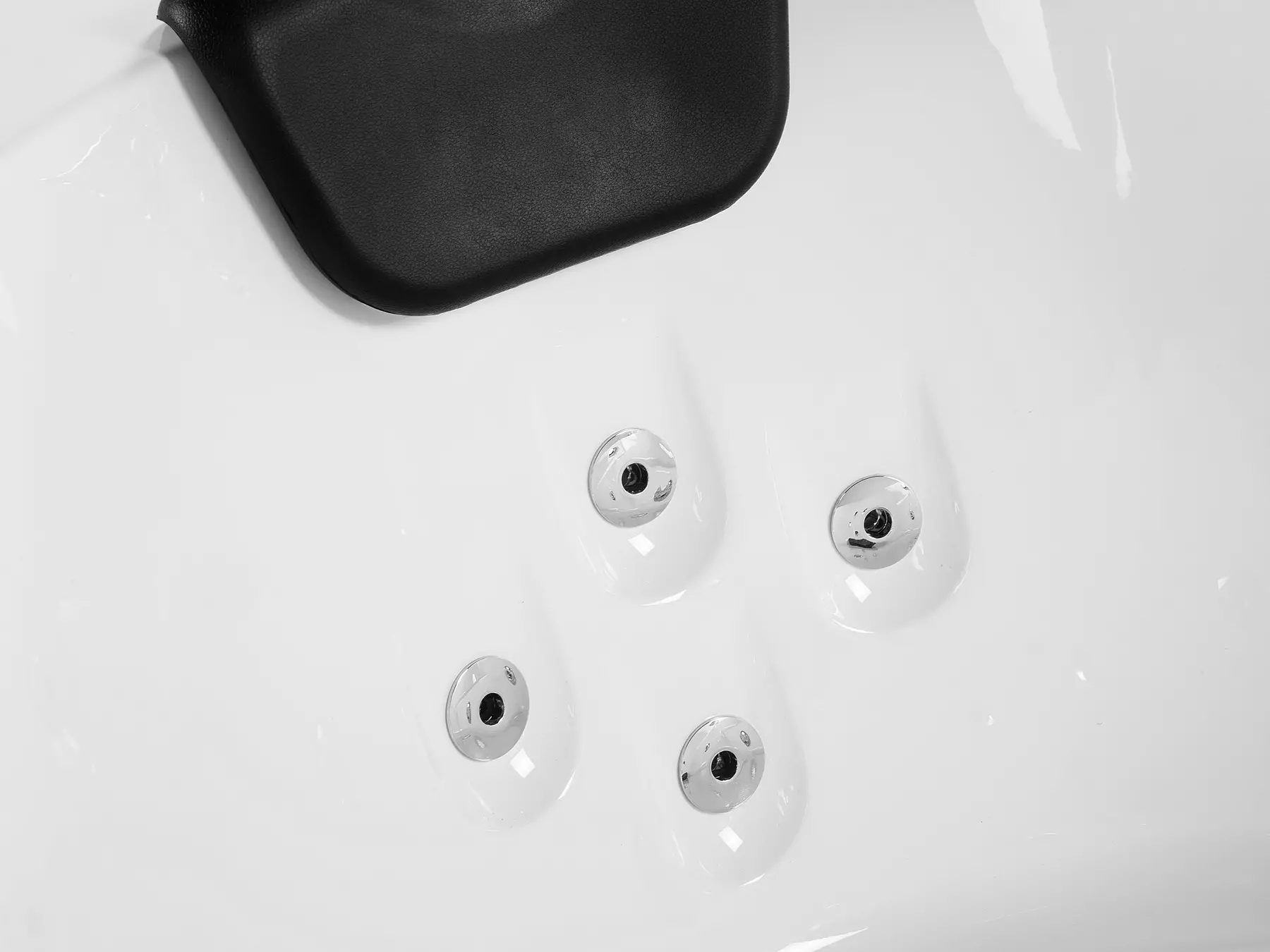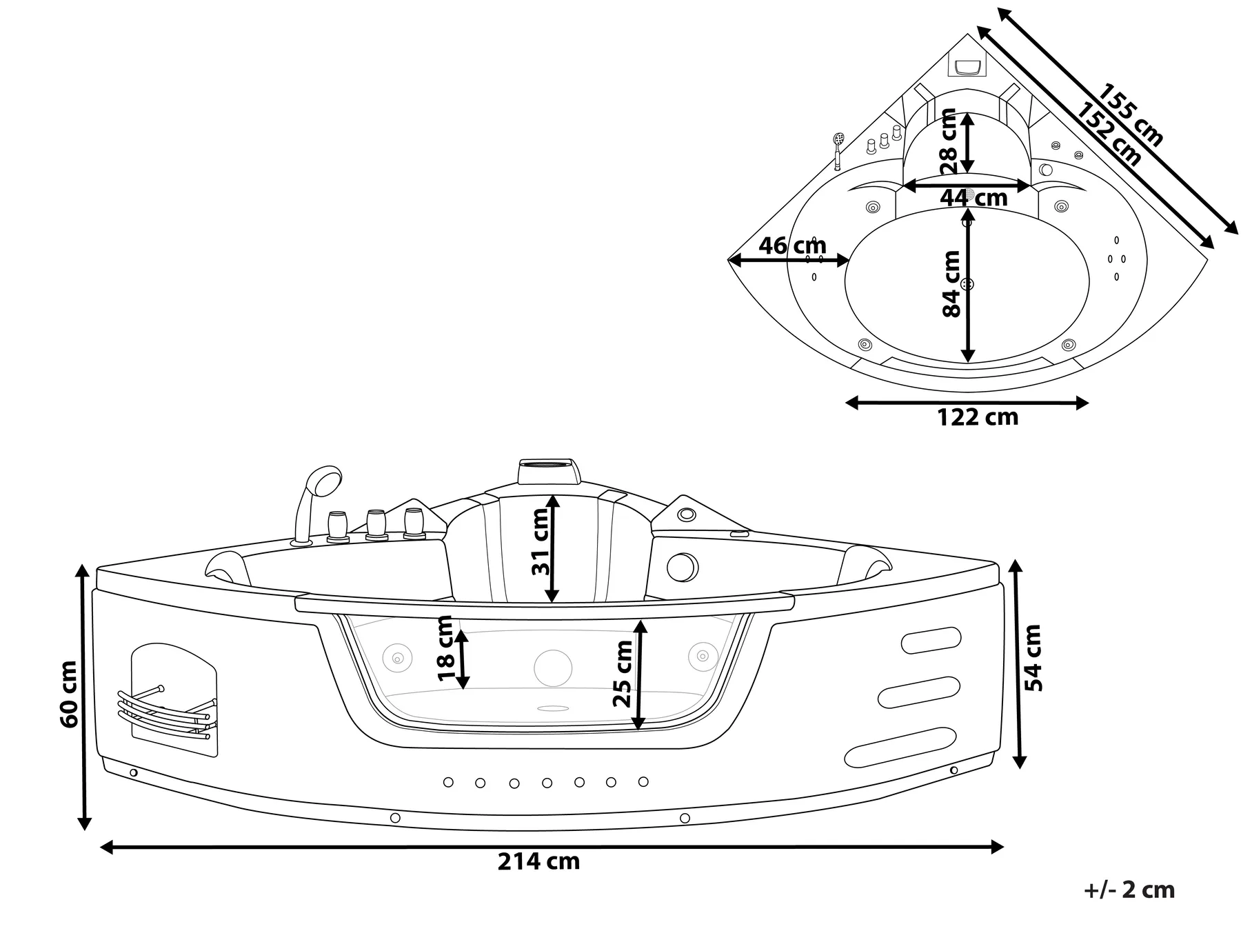 A stunning corner tub with enough room to comfortably accommodate up to two people. Transparent tempered glass panel adds a stylish touch. Designed with elegant chromed fittings, waterfall tap included, and two padded headrests in sophisticated black colour. It comes with 4 large and 8 smaller jet-stream nozzles and an underwater LED lighting system, so you can have a spa-like experience in the comfort of your own home. Featuring an elegant design that will blend with any modern bathroom interior.