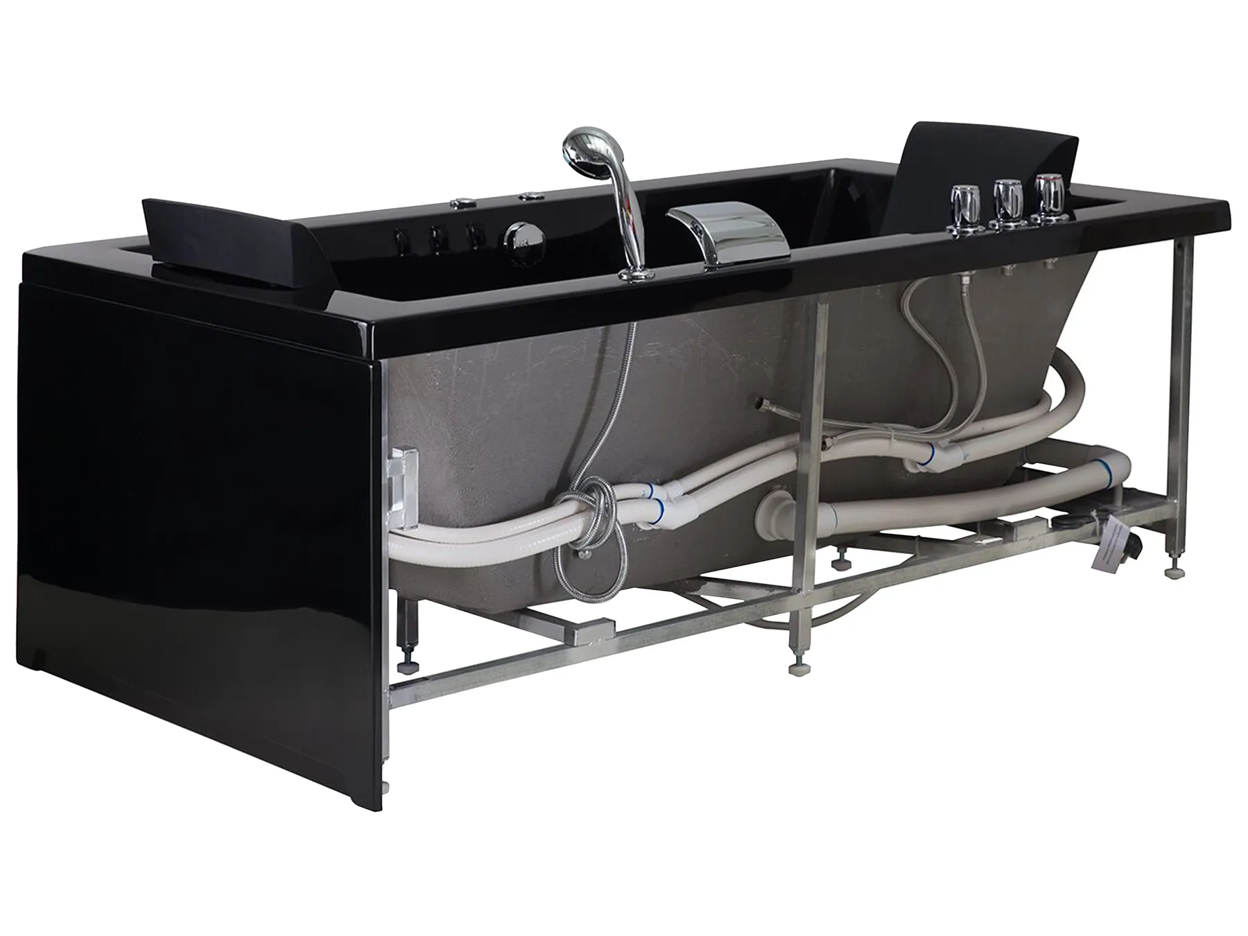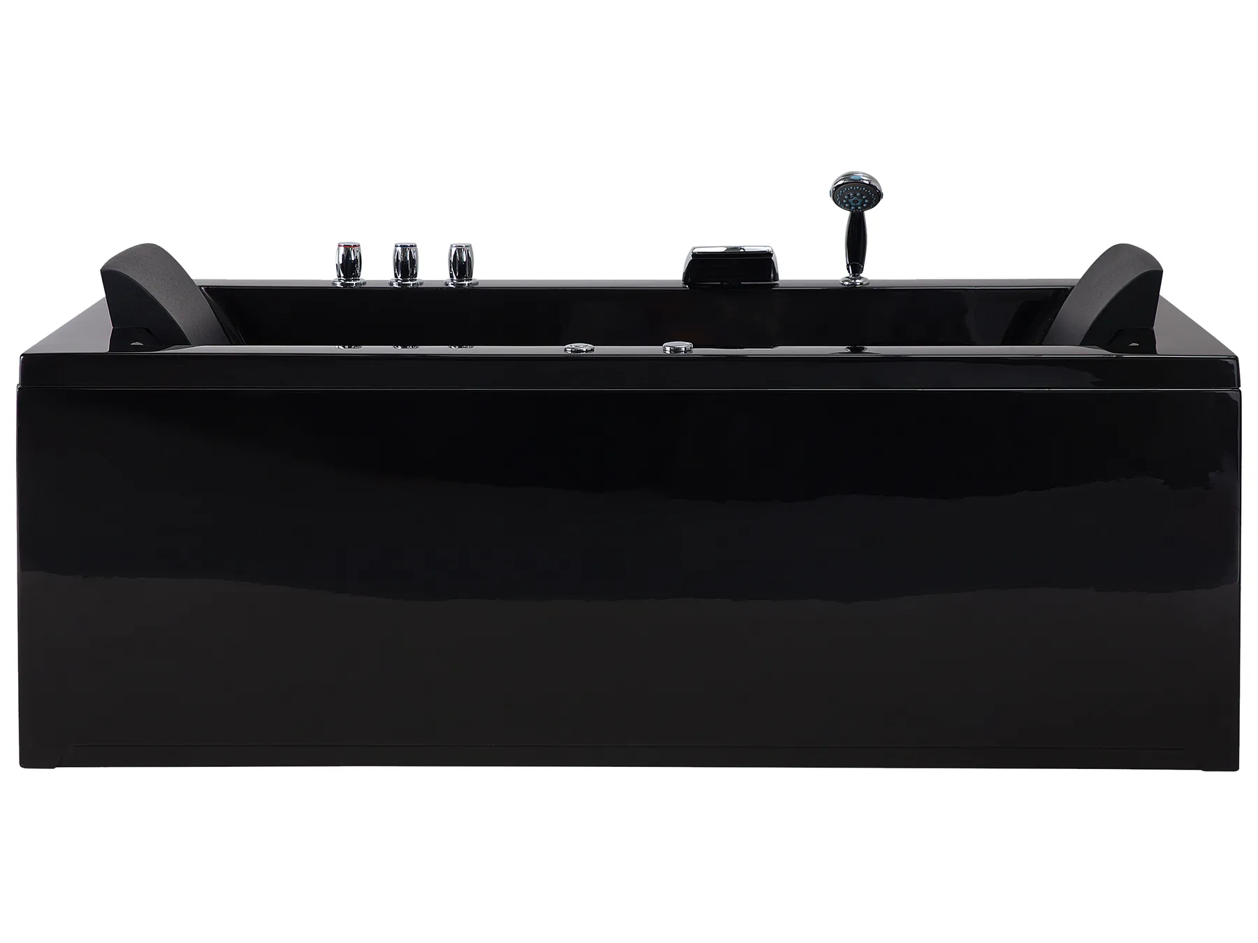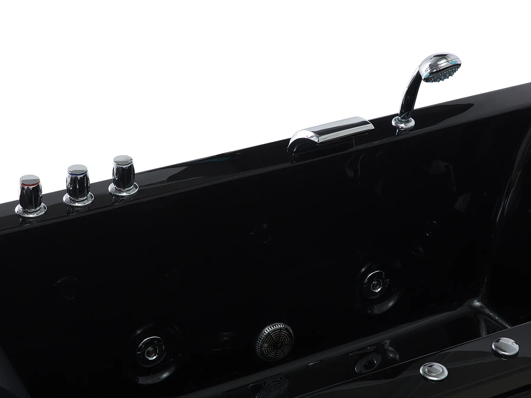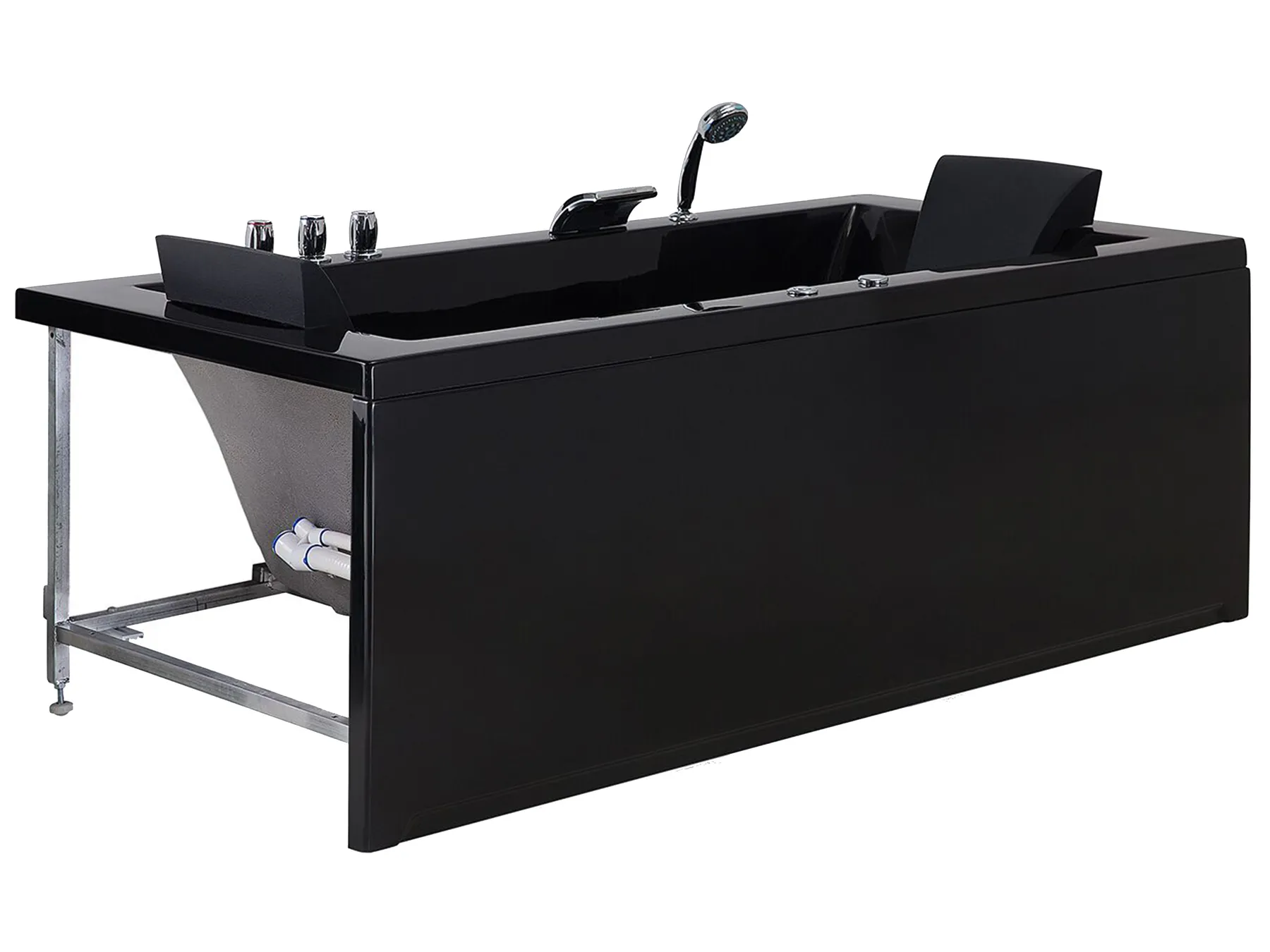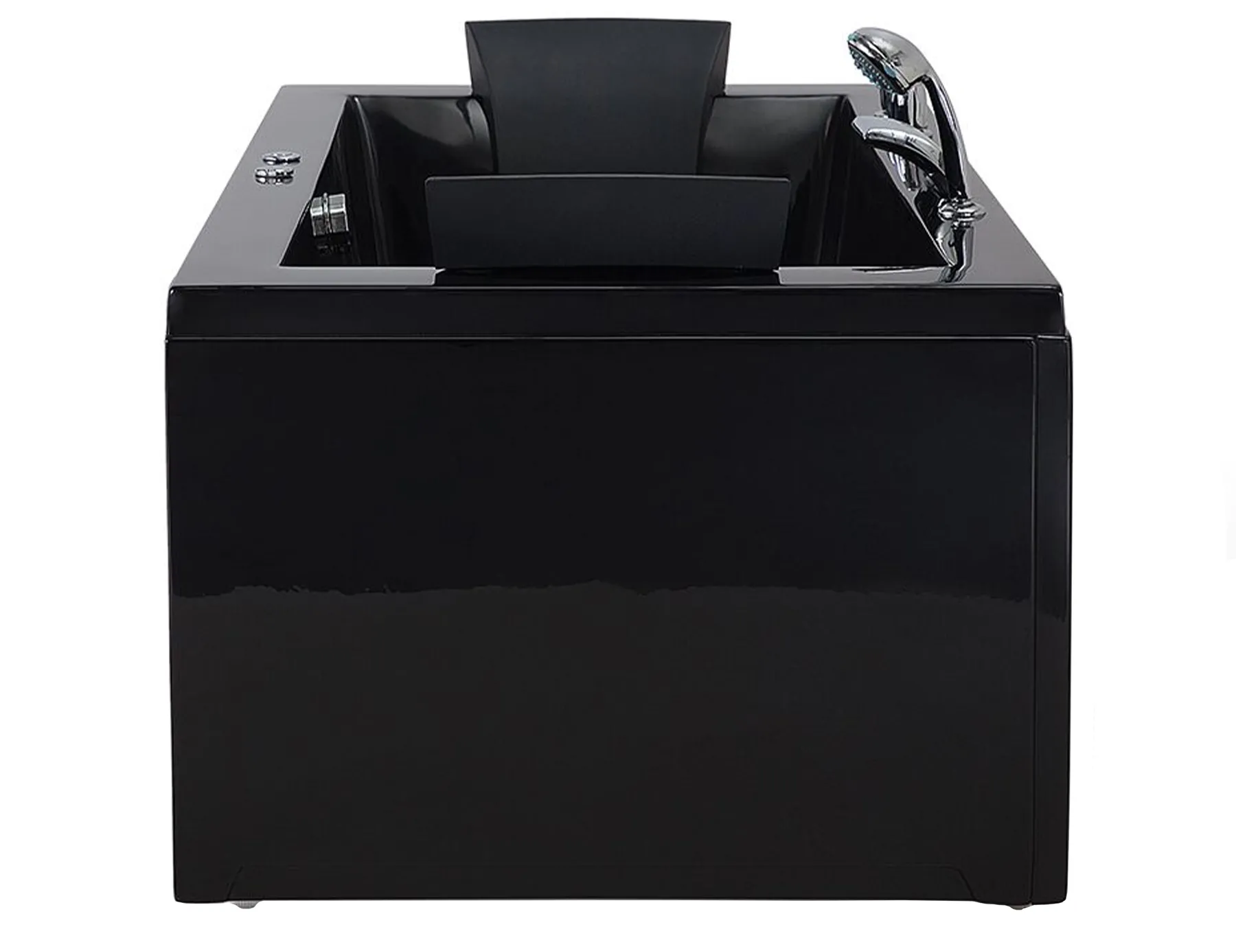 A rectangular bathtub that combines a classic look with the functionality of a bath with massage. Gentle massage provided by jet streams is additionally complemented by underwater lighting, which creates a unique atmosphere. The simple design will add a unique style to your bathroom. The bathtub features elegant chromed fittings including a waterfall tap and two padded headrests in a classic black colour. Thanks to its compact size the tub will work great in small bathrooms. The construction is reinforced with fibreglass for long-lasting durability.