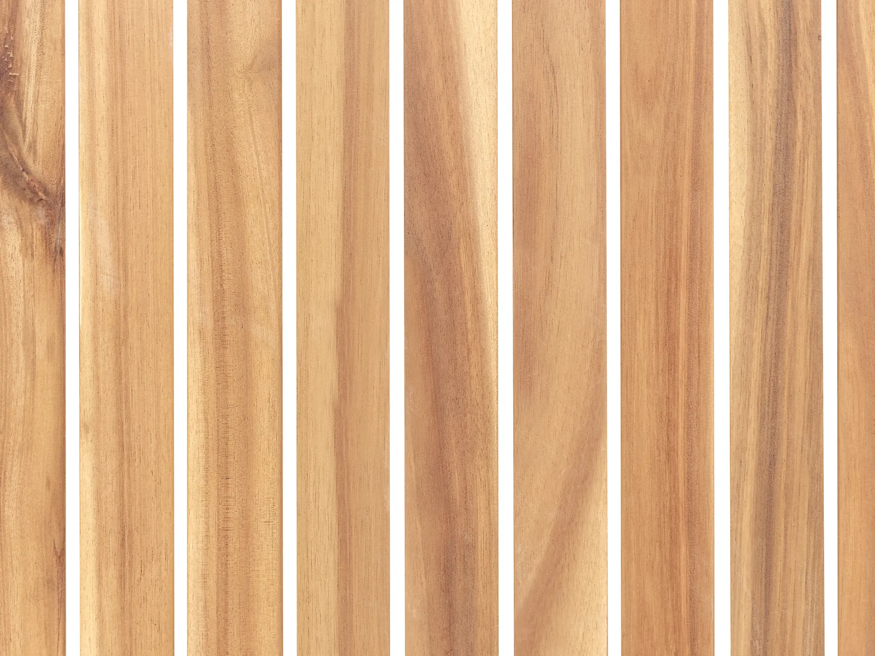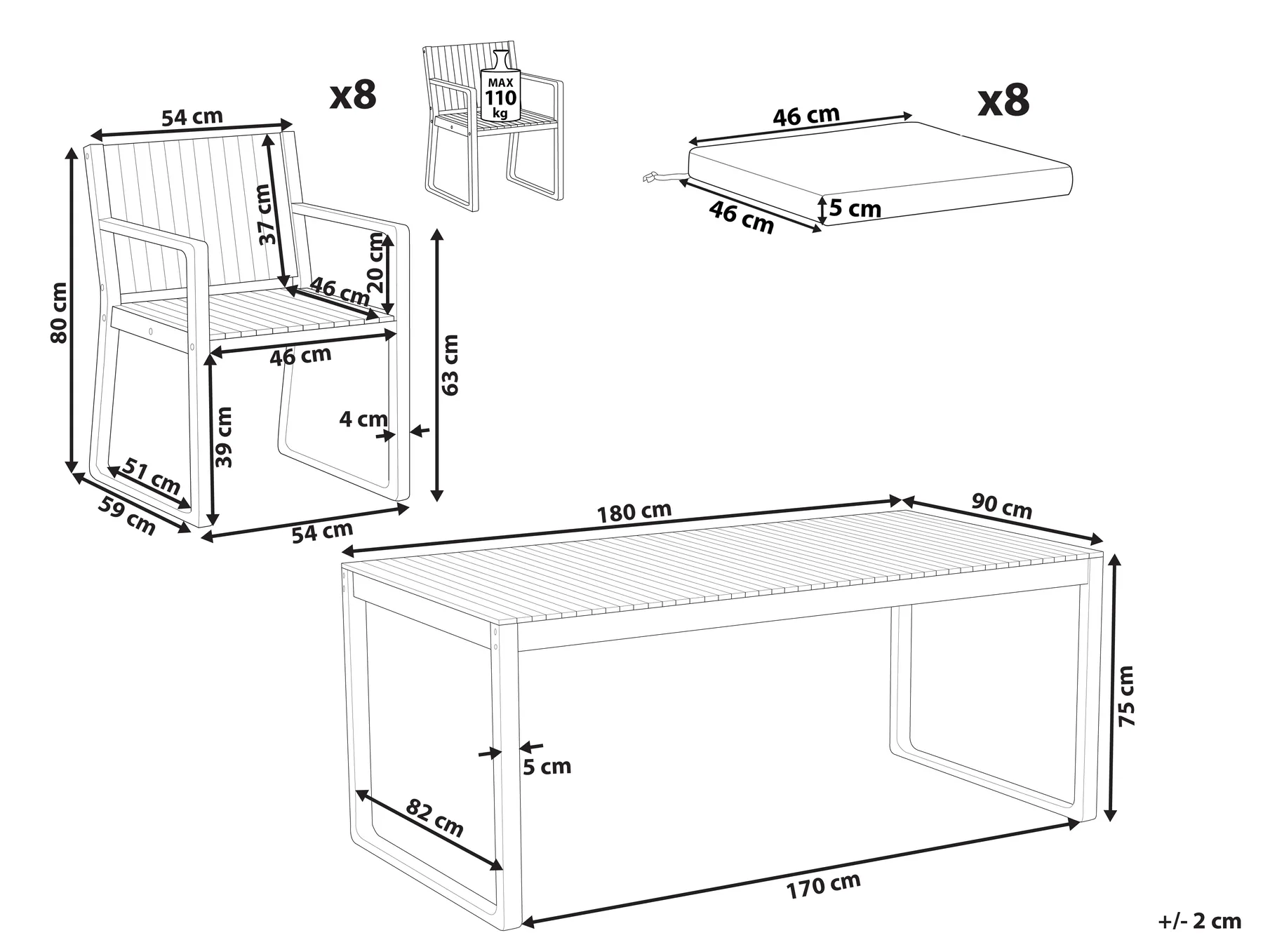 With this wooden set in a simple style, you can create a stylish meeting place in the garden or on the patio for your friends and family. Crafted from certified acacia wood with a trendy slatted design, it blends well with any outdoor décor. The clean-lined table provides enough space for 8 people. Designed with fitted armrests, a wide seat, and a sledge base guarantees high comfort of sitting. Every chair comes with an additional cushion upholstered in a fabric resistant to UV rays in a trendy colour and a thick foam filling, elevating both the comfort of seating and the overall look of the set.