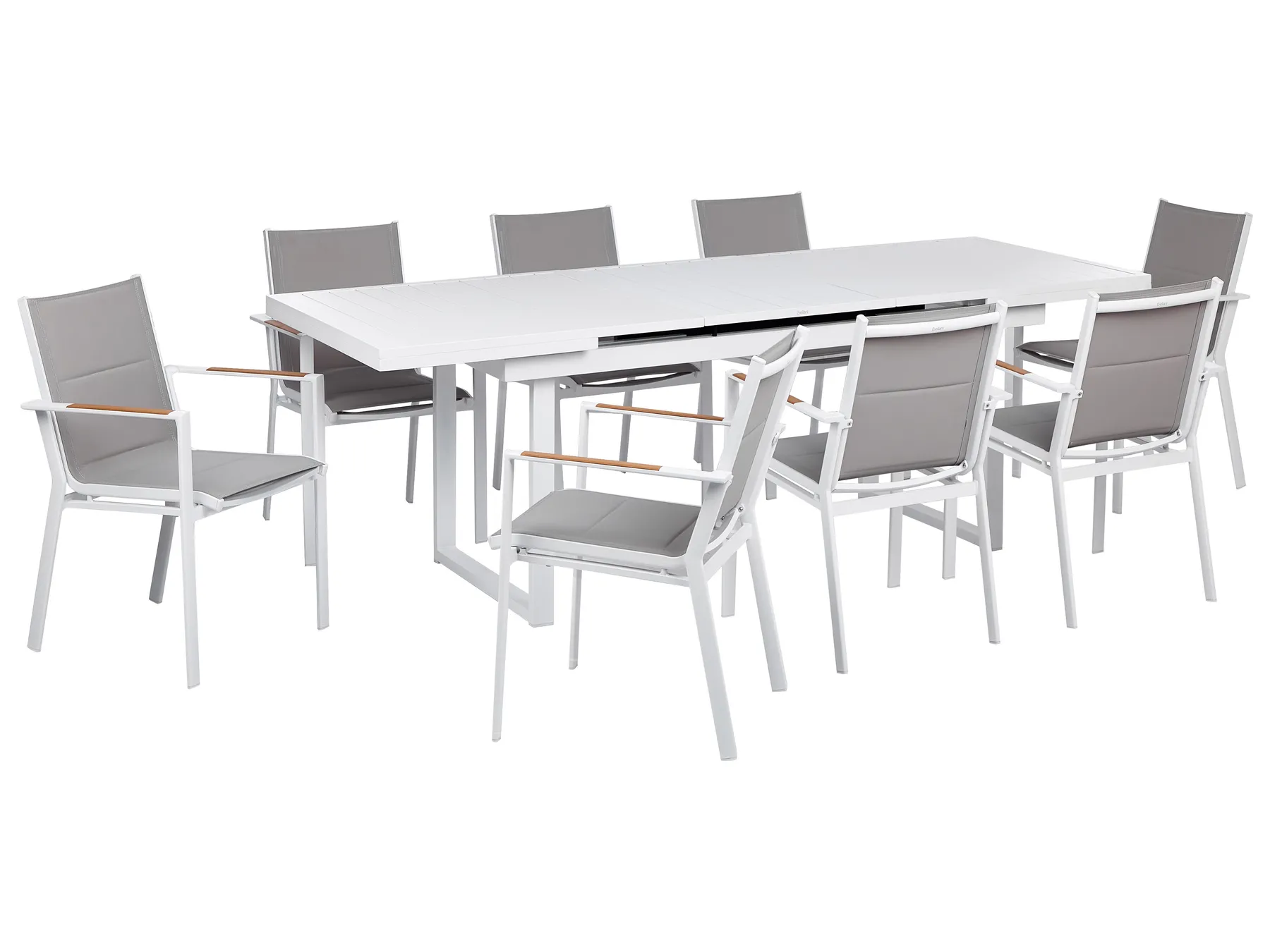 Prepare your garden for family and friends gatherings with this garden set, consisting of an extending table and chairs. The construction is made of aluminium thanks to which the set can be used outside without worry it gets damaged. The chairs with upholstered seat and backrest complement the elegant yet minimalist design of the table. The furniture will match perfectly bigger outdoor areas, bringing in a modern accent.