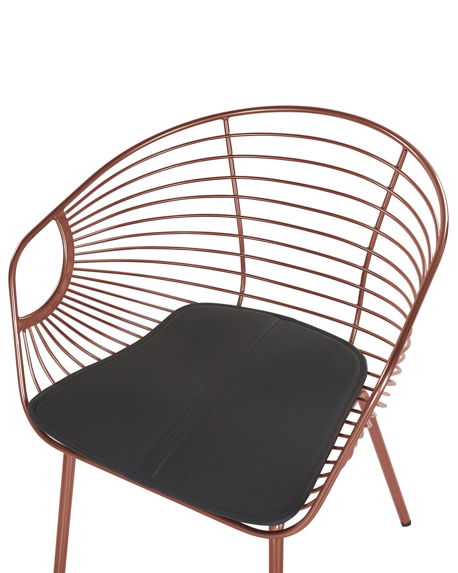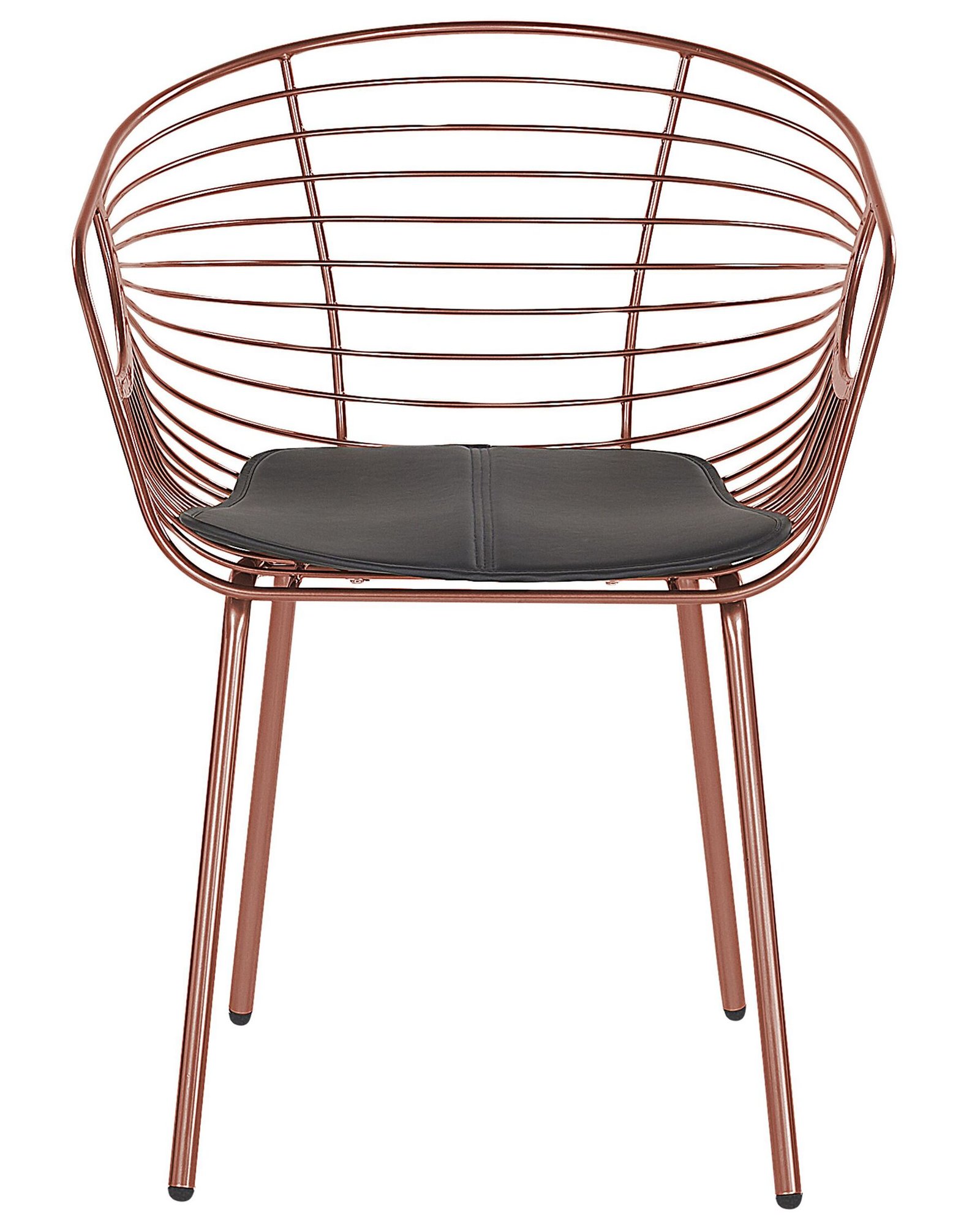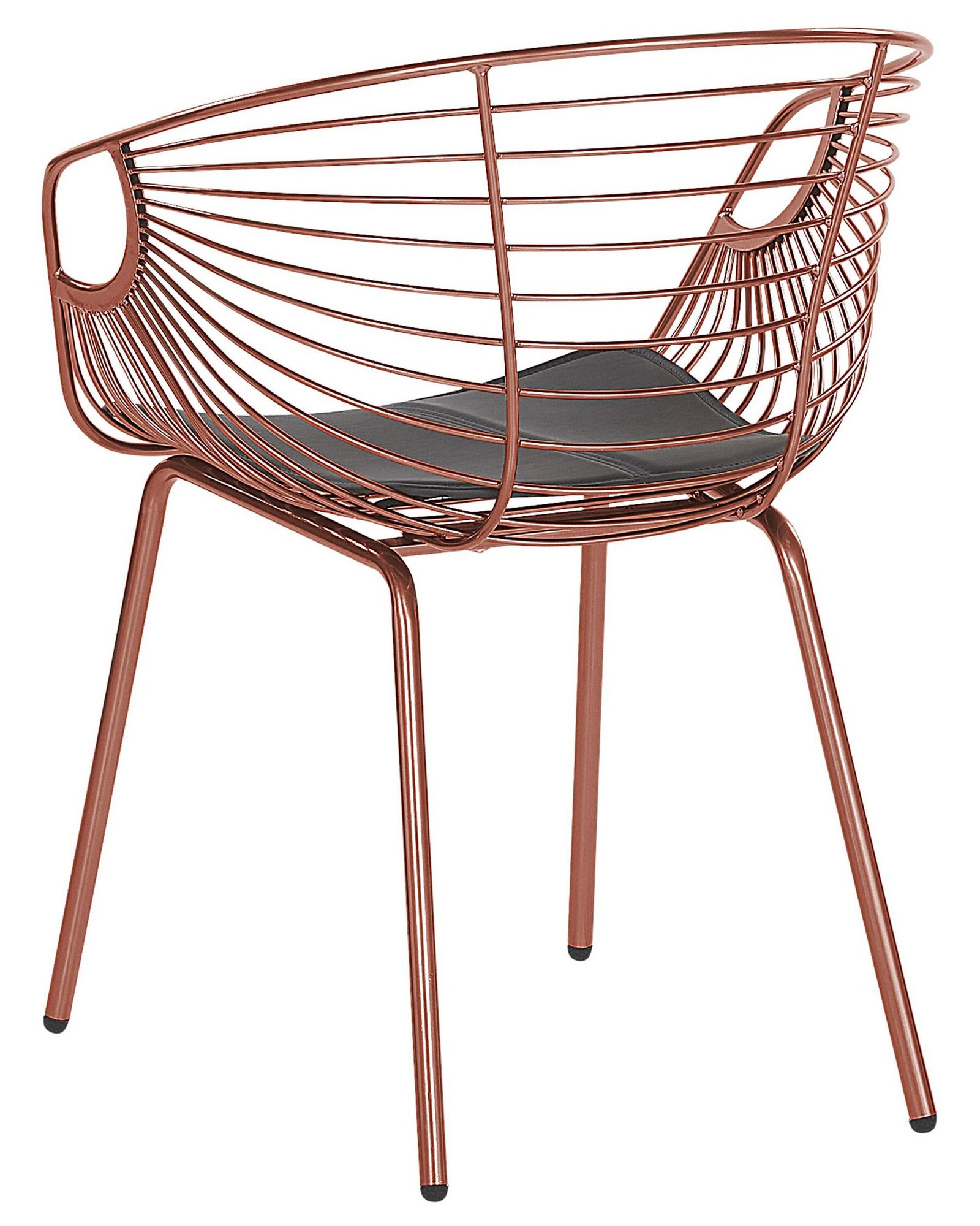 These inspired by industrial forms chairs make a great pair with a wide range of modern interior styles. Made from solid and robust metal, they boast the classic wire design on the backrest and seat. The beautiful, glossy red copper finish and slender legs give it an elegant, glamour touch, making them all the more appealing. The chairs come with seat cushions upholstered in faux leather in a contrasting black colour for extra comfort.